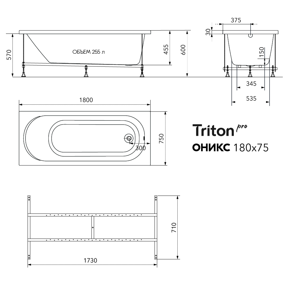 Ванна из 100% литьевого акрила Triton-PRO "Оникс" 180*75 см (чаша ванны)
